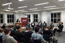 Den Abschluss der Veranstaltung bildete die Podiumsdiskussion „Braucht es mehr Moot in der juristischen Ausbildung?“. Als Diskutanten konnten Dr. Andrea Schmidt (Präsidentin des LG München I), Guido Tiesel (Ministerialdirigent im LJPA), Dr. Thomas Bachmann (Senior Counsel bei Siemens), Professor Dr. Steffen Klumpp (Studiendekan des Fachbereichs Rechtswissenschaft), Maik Knaust (Koordinator des Jessup Teams an der Universität Göttingen) sowie Tim Walz (Teilnehmer des Nuremberg Moot Courts, des Jessup Moot Courts und Coach des Jessup Moot Courts) begrüßt werden. Aus der Podiumsdiskussion gingen neue Ideen bezüglich des Einsatzes von Moots sowie Kooperationsformen mit der Praxis und Potentiale zu konkreten Verbesserungenmöglichkeiten an der FAU hervor. Die Bedeutung der Thematik wurde insbesondere durch die anschließende lebhafte Debatte mit dem Publikum deutlich.