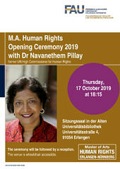 Am Donnerstag, den 17.10.2019 fand die Eröffnungszeremonie für den Masterstudiengang Human Rights im Sitzungssaal der Alten Universitätsbibliothek mit Dr. Navi Pillay statt. Die ehemalige UNO-Hochkommissarin für Menschenrechte und Präsidentin des Kuratoriums der International Nuremberg Principles Academy erzählte interessante und motivierende, teils biografische Anekdoten. Die Veranstaltung war ein gelungener Startschuss für den neuen Jahrgang des Human Rights-Studiengangs. Wir bedanken uns bei Dr. Navi Pillay und freuen uns, wenn sie hoffentlich bald wieder einmal bei uns zu Gast ist.