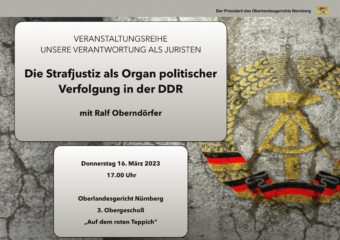 Am Donnerstag den 16. März 2023 um 17 Uhr lädt der Präsident des Oberlandesgerichts Nürnberg, Herr Dr. Thomas Dickert, herzlich zum nächsten Vortrag, „Die Strafjustiz als Organ politischer Verfolgung in der DDR“ mit Ralf Oberndörfer, aus der Veranstaltungsreihe „Unsere Verantwortung als Juristen“. Die Veranstaltung findet am OLG Nürnberg im 3. Obergeschoß „Auf dem roten Teppich“ statt. Aufgrund der berenzten Anzahl an Plätzen wird eine formolse Anmeldung per E-Mail an Uwe.Frommhold@olg-n.bayern.de erbeten.
