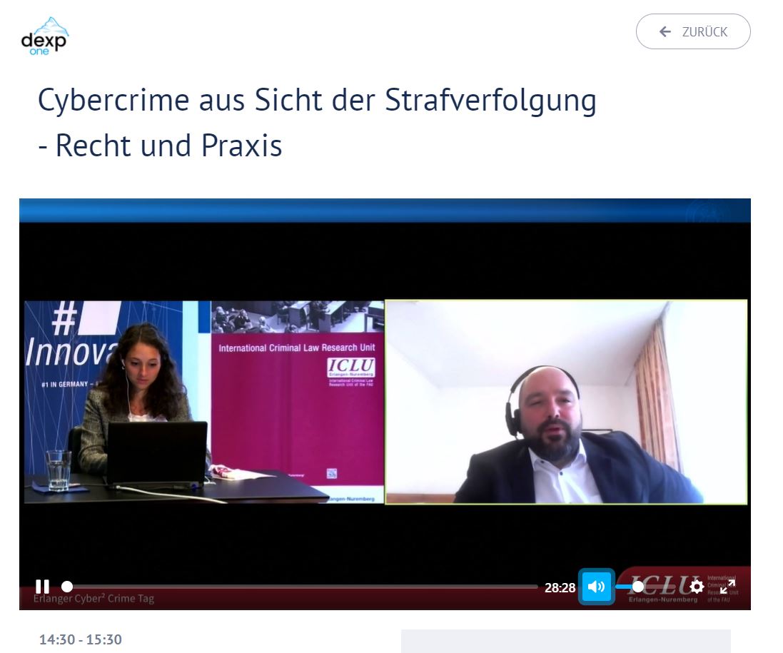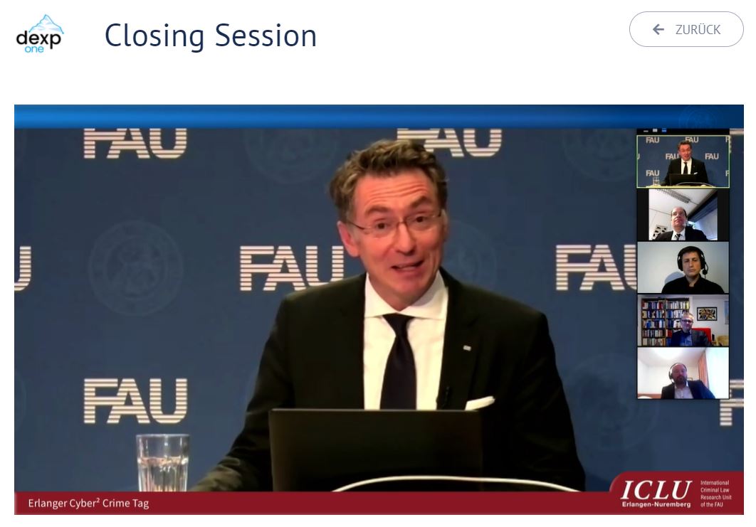 9/9Im Anschluss an die erste erfolgreiche Online-Veranstaltung im Jahr 2020 aus der Veranstaltungsreihe des Erlanger Cybercrime Tages (ECCT) fand am 23.9.2021 zum zweiten Mal der EC²CT statt. Auch dieses Jahr trafen sich rund 100 Teilnehmende im Cyberspace auf der interaktiven Plattform von dexp.one und verfolgten den Livestream, der aus der Erlanger Schlossaula auf die heimischen Bildschirme übertragen wurde – sogar über die Landesgrenzen hinaus. Thema der vom Bundesinnenministerium geförderten Konferenz war dieses Jahr die „Internationale Strafverfolgung von Cybercrime Delikten“