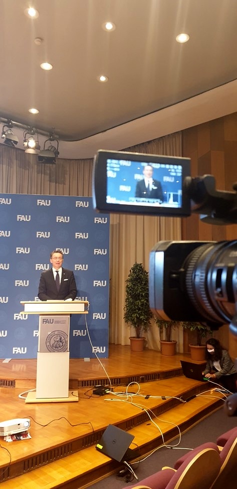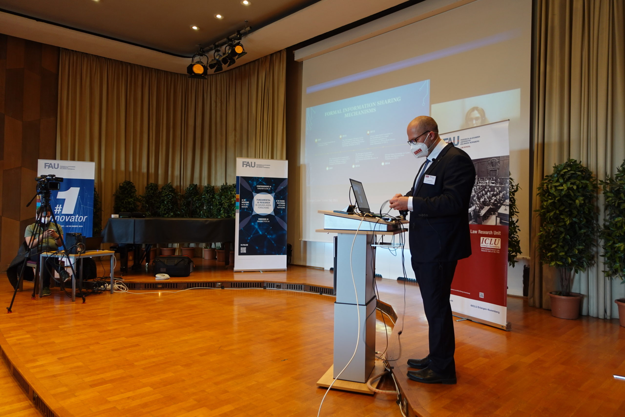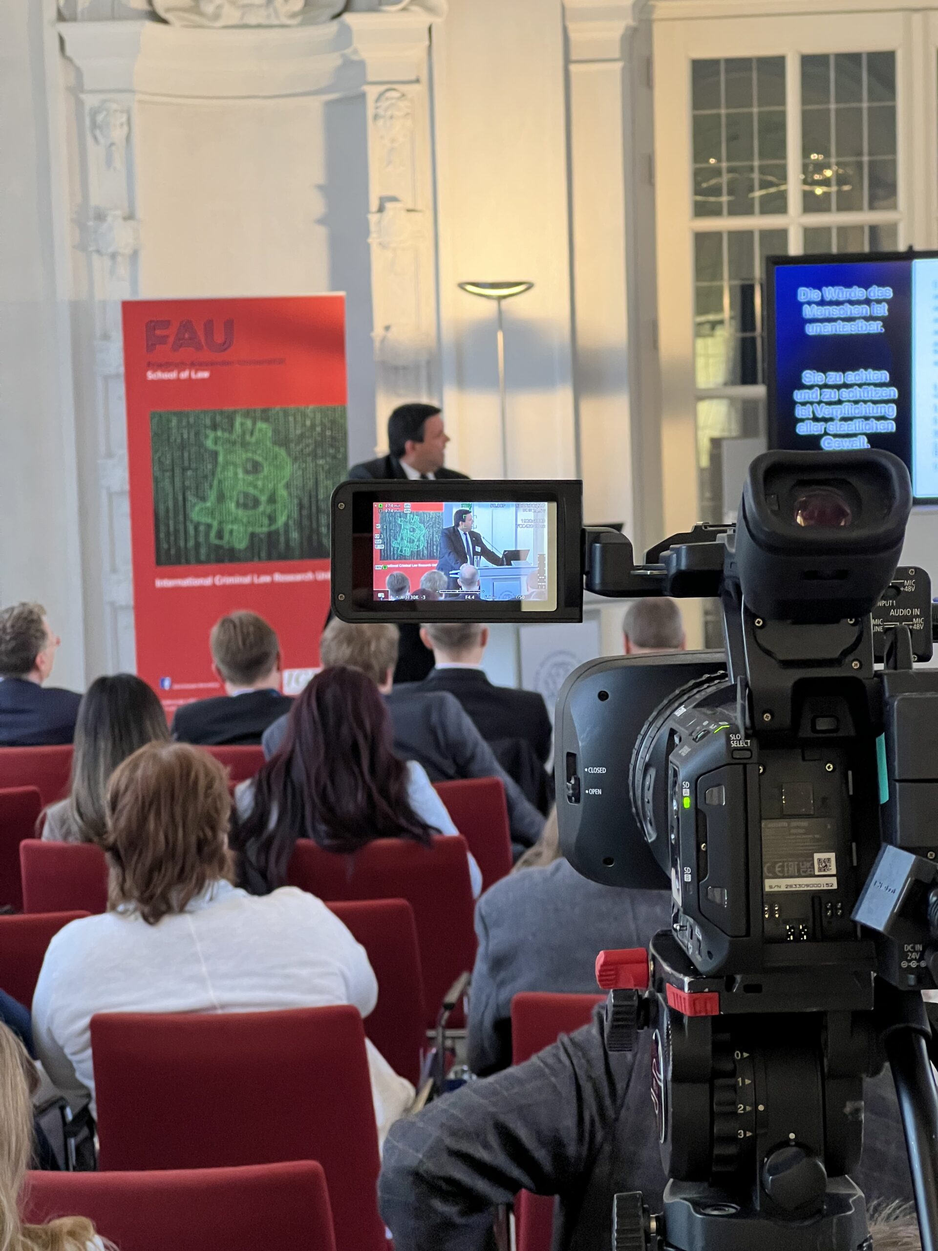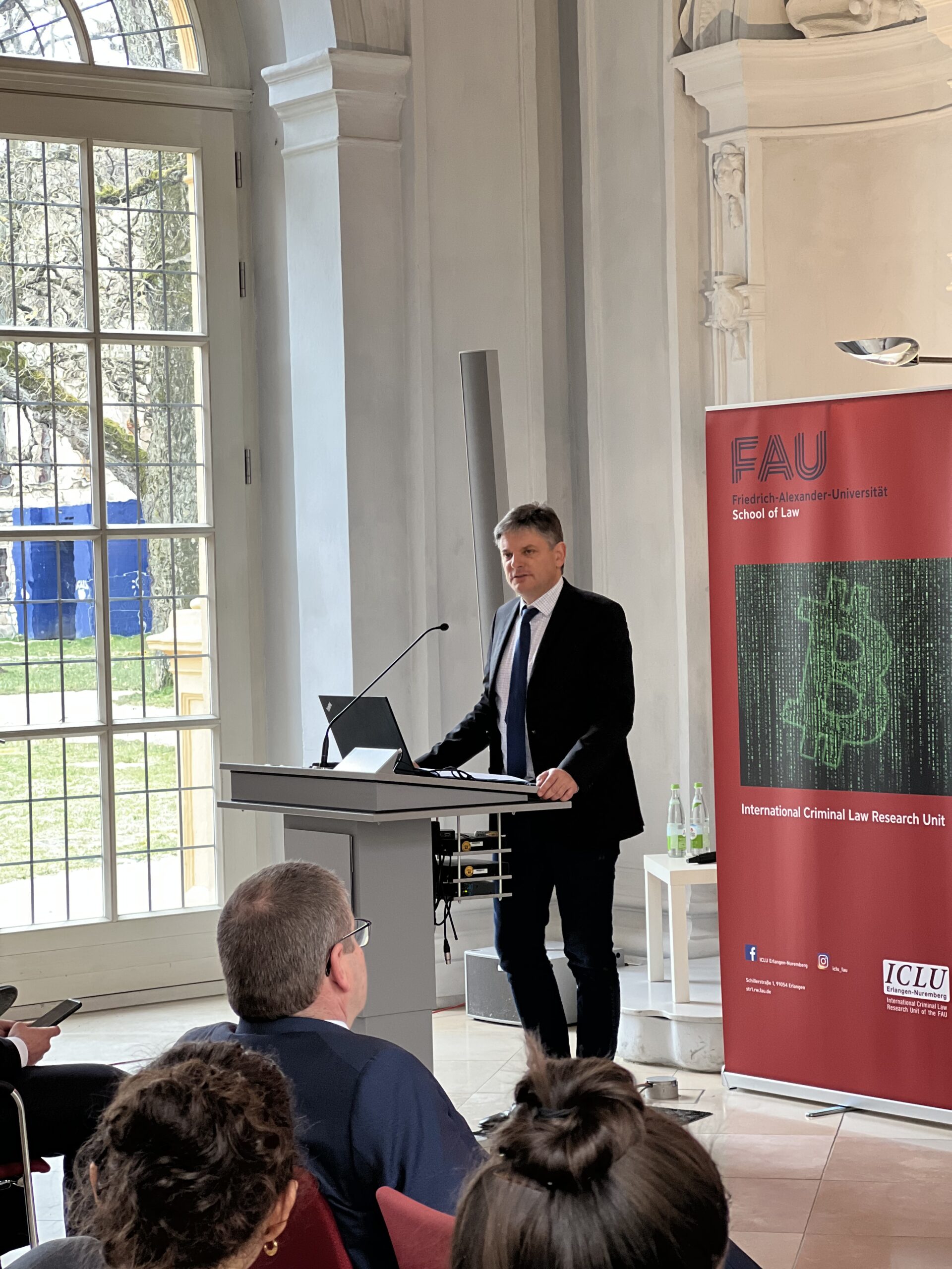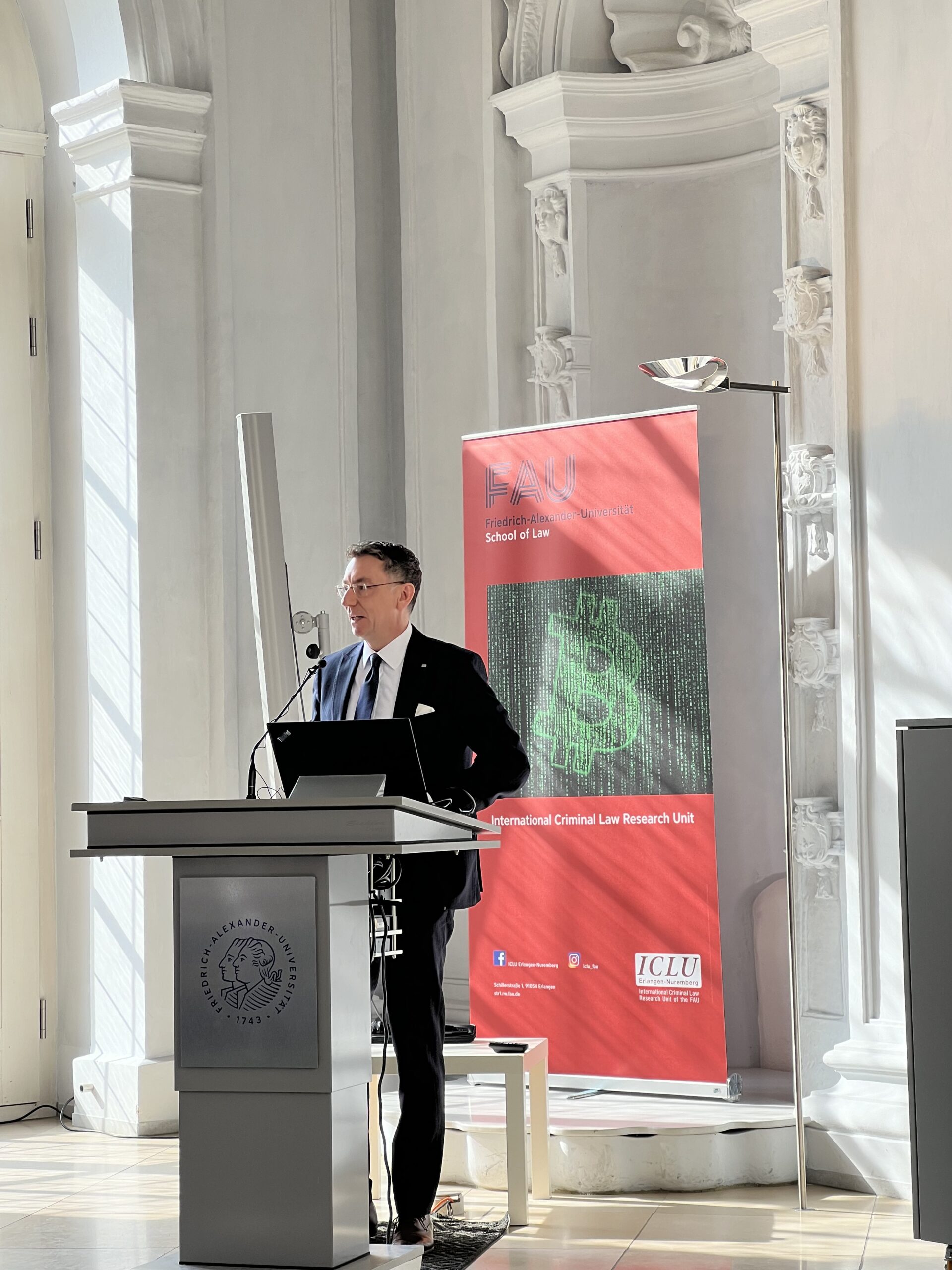 In seiner Begrüßungsrede hieß Professor Dr. Joachim Hornegger, Präsident der Friedrich-Alexander-Universität, die Teilnehmer:innen – sowohl im Saal als auch im virtuelle Raum -, die Referent:innen, sowie Helfer:innen herzlich willkommen. Anschließend richtete auch Professor Dr. Christoph Safferling seine Grußworte an das Publikum. Neben den Herausforderungen und Problemen, betonte er den internationalen Bezug der Thematik und die Verknüpfung zu menschenrechtlichen Fragestellungen.