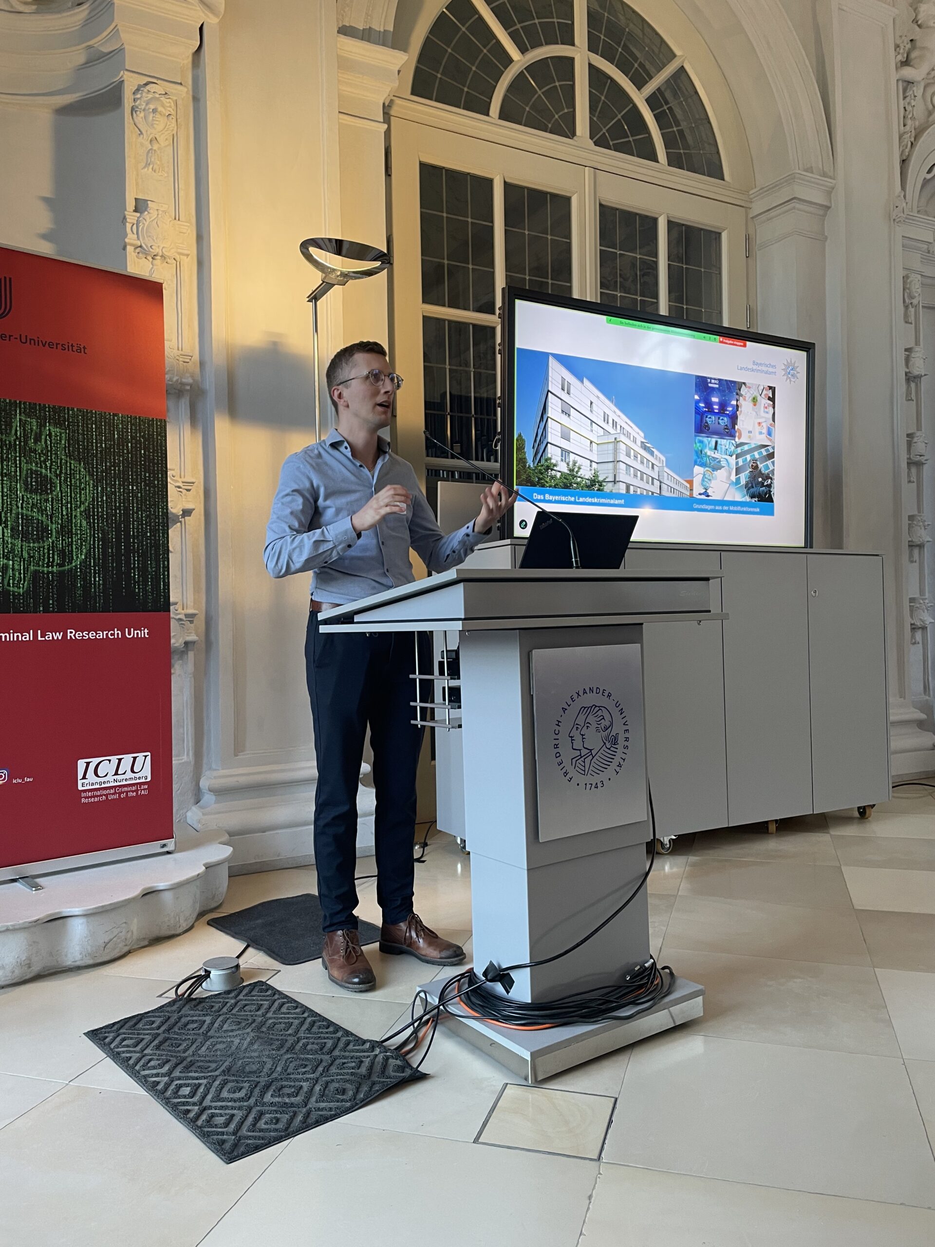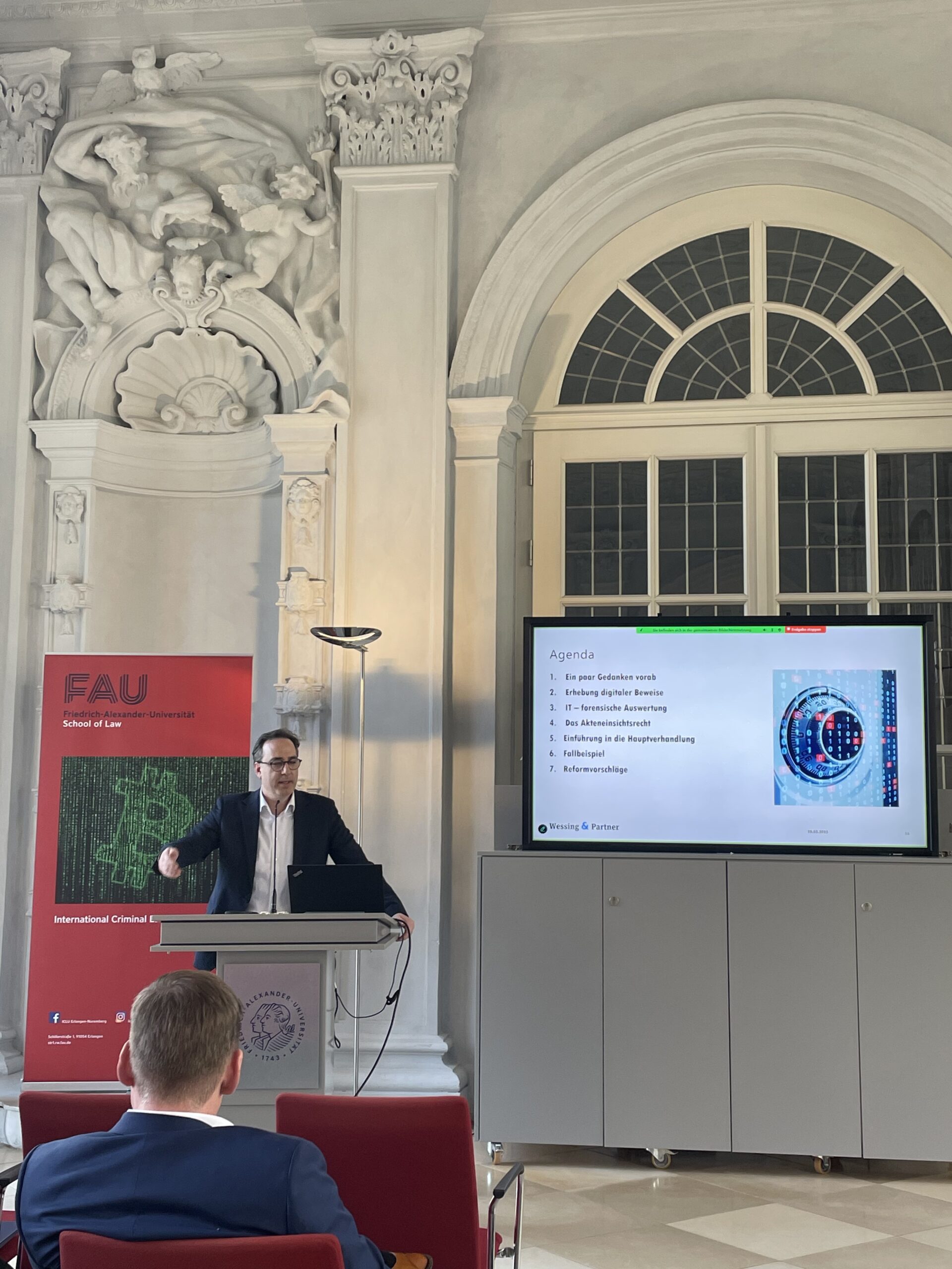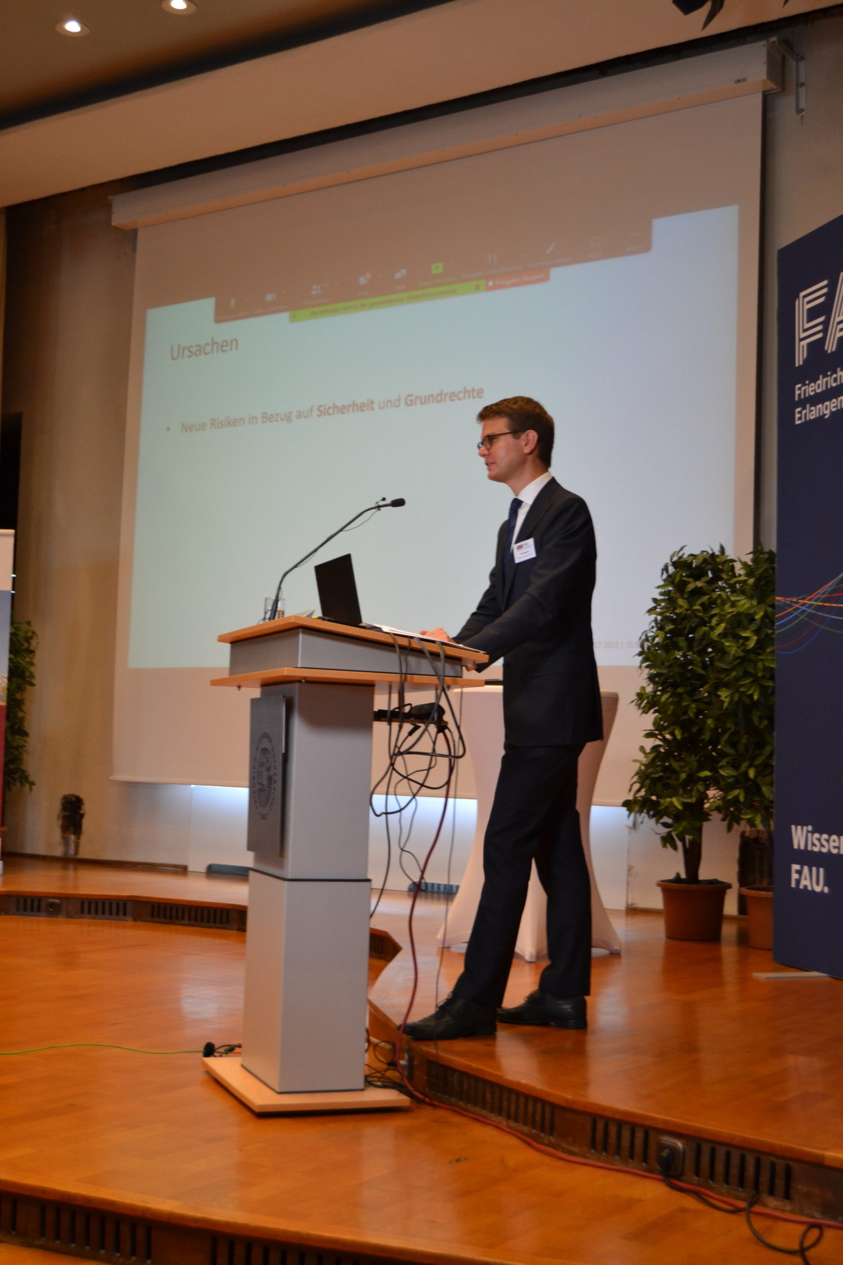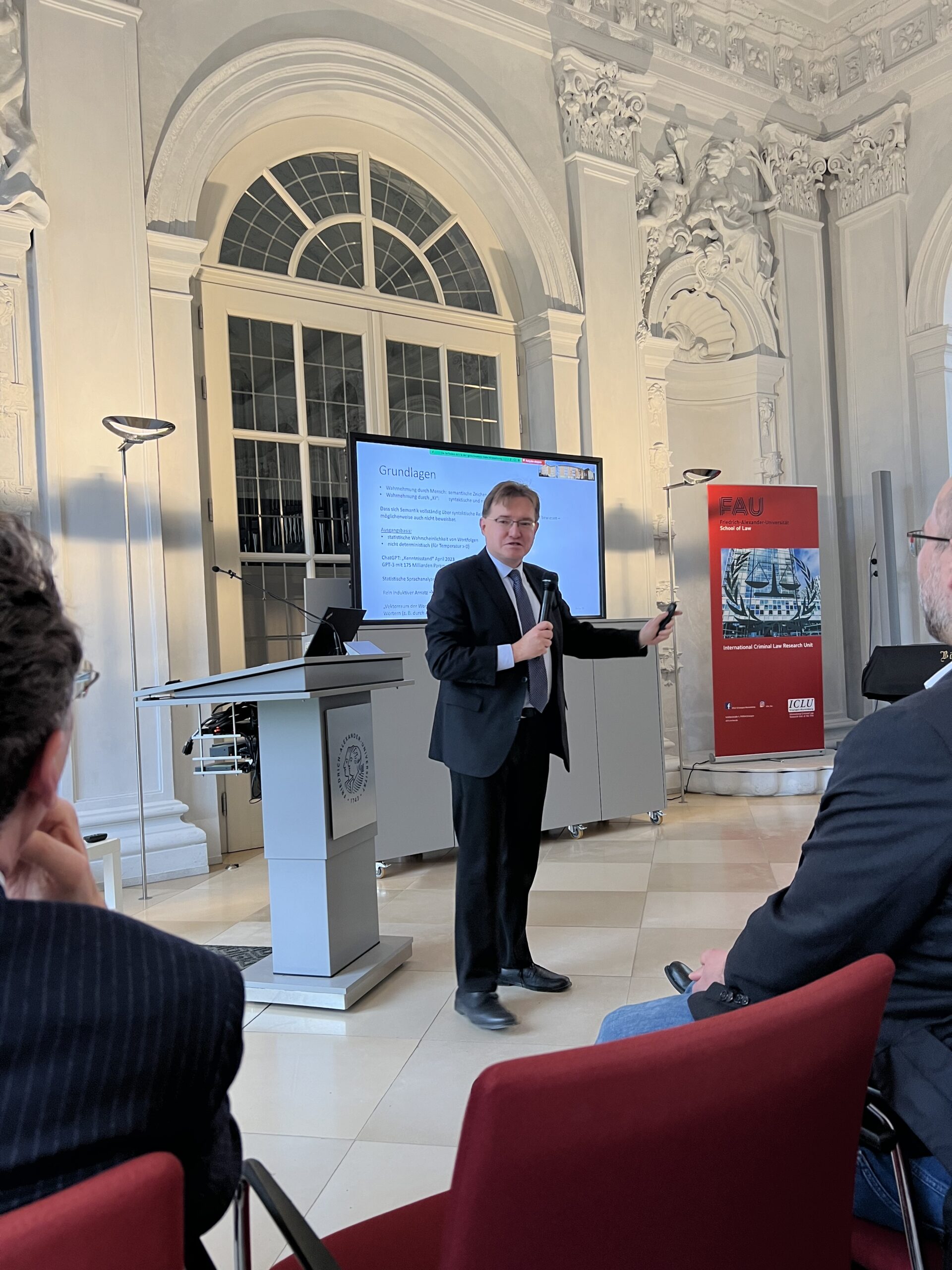 Dieses Mal erfolgte die Begrüßung der Referent:innen und Teilnehmer:innen durch den Präsidenten der Friedrich-Alexander-Universität Erlangen-Nürnberg, Professor Dr. Joachim Hornegger und Professor Dr. Kudlich, Inhaber des Lehrstuhls für Strafrecht, Strafprozessrecht und Rechtsphilosophie und Sprecher des Graduiertenkollegs „Cybercrime und Forensische Informatik“ an der FAU. Letzterer übergab das Wort – auch nach der ein oder anderen persönlichen Anekdote – an den ersten Referenten, Professor Dr. Christian Rückert, Lehrstuhlinhaber an der Universität Bayreuth. Der ehemalige FAU-Habilitand, der die Veranstaltung selbst jahrelang organisierte und mitgestaltete, führte quasi als Heimspiel die Teilnehmer:innen und Interessierten in die Thematik ein und hielt den ersten Vortrag. Als Einstieg ging er auf die These „Was jede Privatperson darf, muss die Strafverfolgungsbehörde erst Recht dürfen“ ein, und erörterte anhand der Ermittlung einer angemessenen Rechtsgrundlage, wieso dieser Gedanke problematisch ist. Der Vortrag spielte sich jedoch nicht nur in der Strafprozessordnung ab, sondern wurde durch Ausblicke ins Verfassungsrecht, Datenschutzrecht und Europäische Strafrecht abgerundet.
