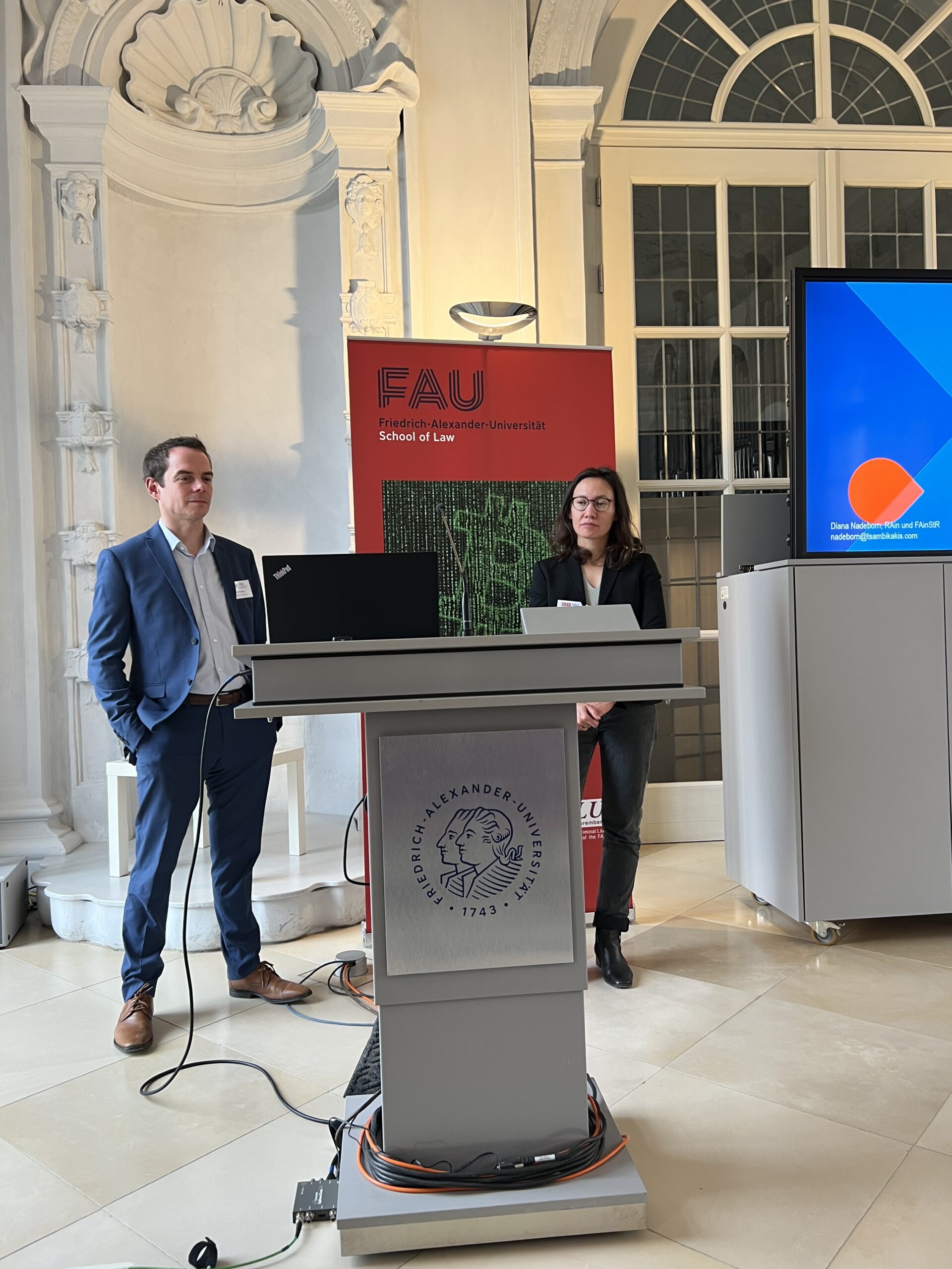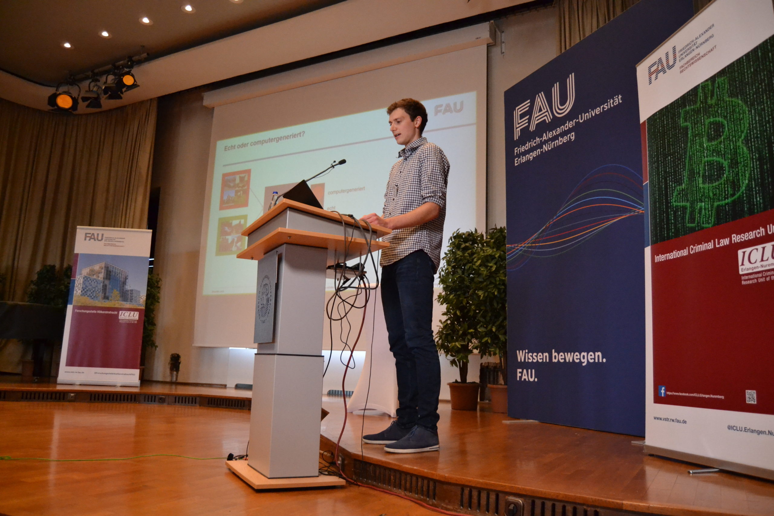 Nach der Mittagspause übernahm Benedikt Lorch, wissenschaftlicher Mitarbeiter am Lehrstuhl für IT-Sicherheitsinfrastrukturen und Mitglied im Graduiertenkolleg „Cyberkriminalität und Forensische Informatik“ an der FAU, mit seinem Vortrag zu „Forensische Bildanalyse mithilfe von Künstlicher Intelligenz“ die Bühne. Dieser Vortrag nahm insbesondere die Jurist:innen im Publikum mit, da er zunächst grundlegende Fragen wie die Definition und Funktionsweise von KI erklärte. Anschaulich verdeutlichte Benedikt Lorch auch die Probleme selbst lernender KI und das enorme Gewicht, welches den Datensätzen zukommt, anhand derer eine KI lernt.