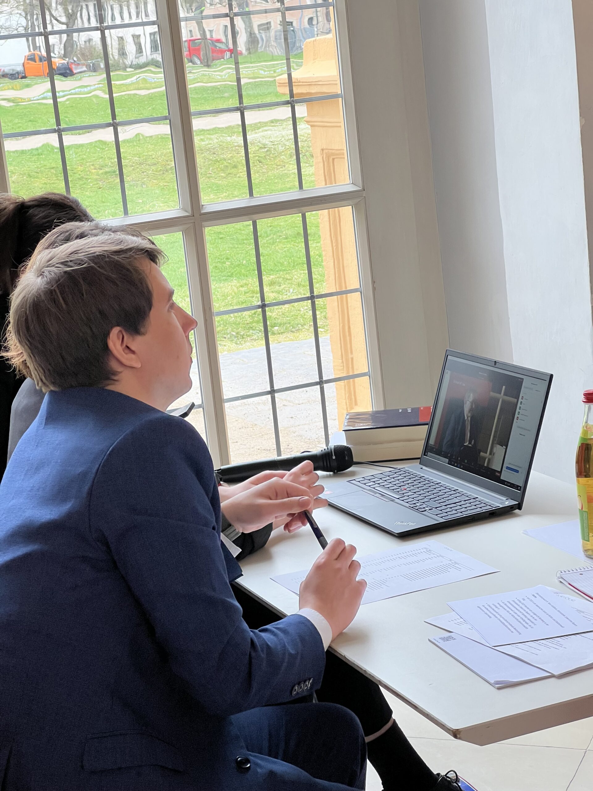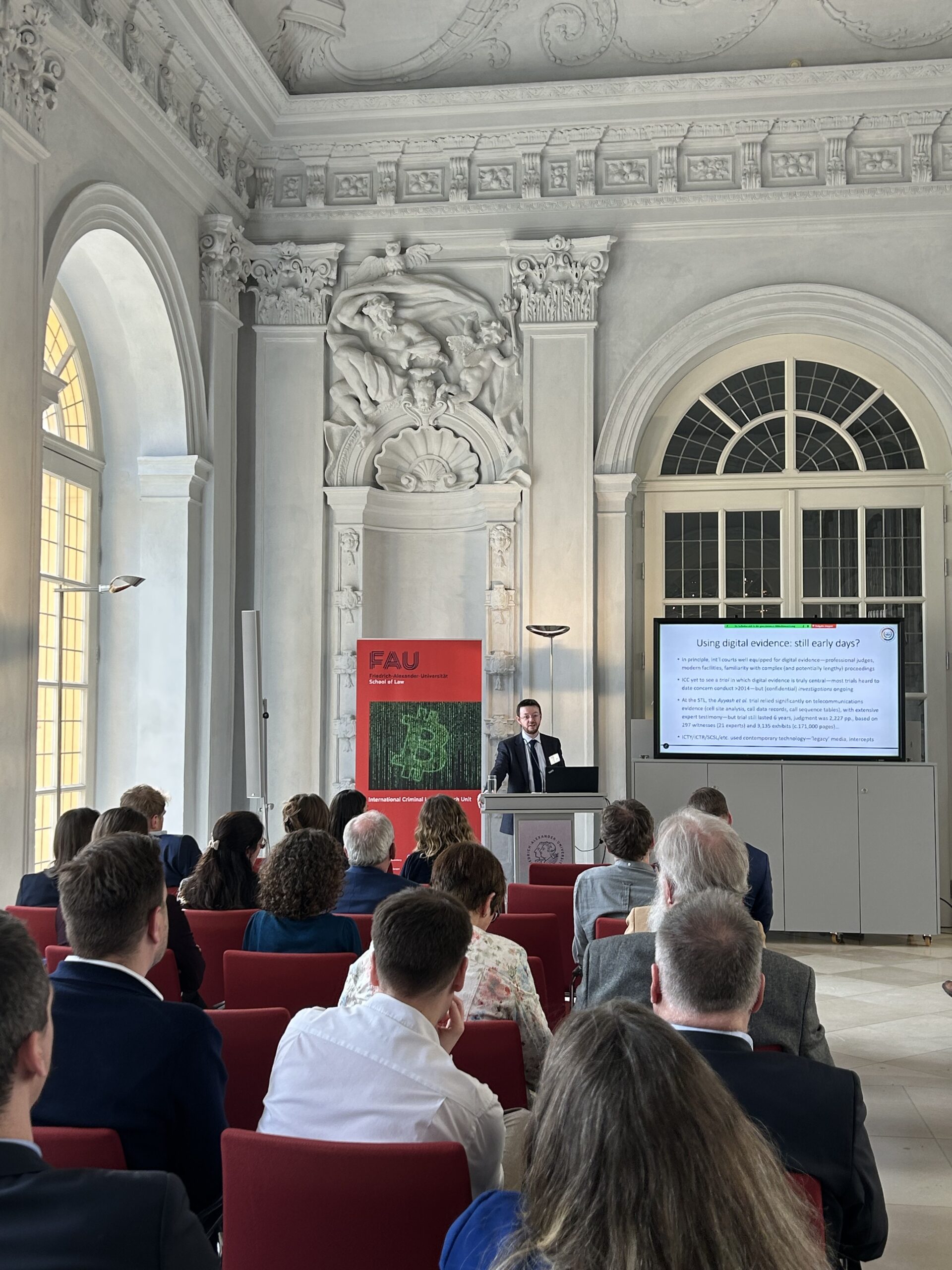 Nach einer stärkenden Mittagspause stand ein weiteres Highlight auf dem Programm: Matthew Cross, Appeals Counsel der Anklagebehörde am Internationalen Gerichtshof, gewährte einen Einblick in den Umgang und die Herausforderungen mit digitalen Beweismitteln an internationalen Strafgerichtshöfen. Zunächst beleuchtete er die Verwendung und heutige Bedeutung von digitalen Beweismitteln am internationalen Strafgerichtshof und stellte anschließend Prinzipien vor, die sich im Laufe der Zeit entwickelt haben.