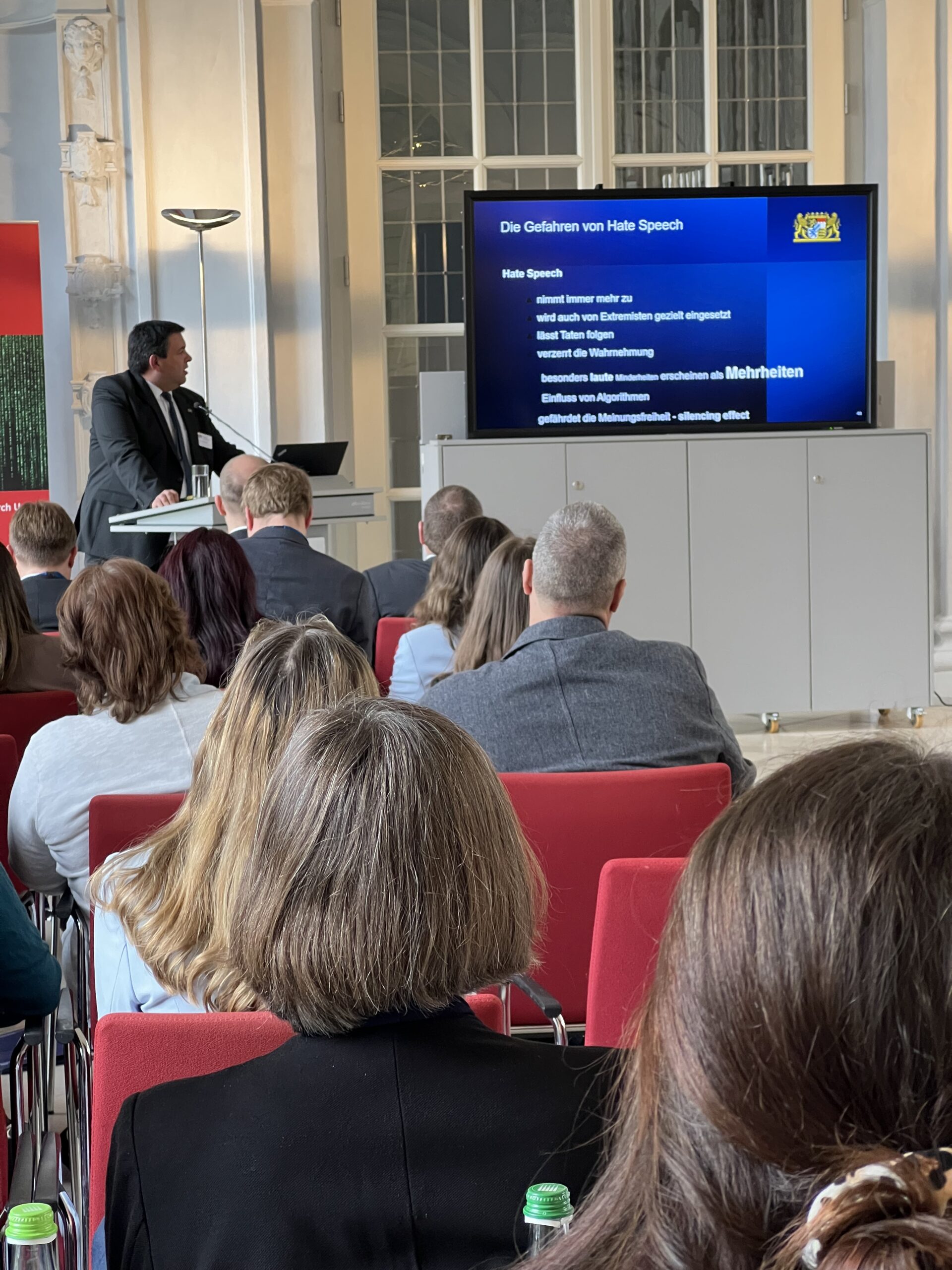 Nach der Mittagspause kam dann ein dem Cybercrime Tag nicht unbekanntes Gesicht mit einem Vortrag zu „Hate Speech und Generative KI – tatsächliche und rechtliche Fragestellungen“ an die Reihe. Leitender Oberstaatsanwalt Thomas Goger bereicherte bereits im Jahr 2021 die Veranstaltung mit einer Vorstellung des sog. Dark Web Monitors. Dieses Mal präsentierte der Jurist dem Publikum sein umfassendes technisches Verständnis. Exemplarisch wurden bekannte Sprachmodelle und Bildgeneratoren vorgestellt und diverse Prompts mit entsprechenden gewünschten oder nichtgewünschten Ergebnissen aufgezeigt. Hier wird das allgegenwärtige Spannungsfeld zwischen rasanter technischer Entwicklung und der im Vergleich dazu statischen Entwicklung und Forschung des Rechts deutlich.